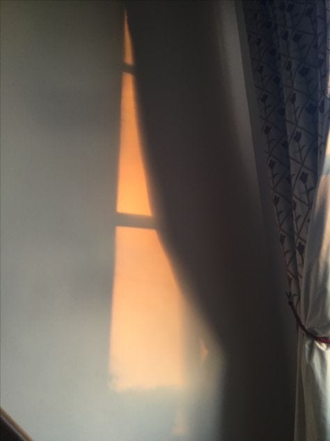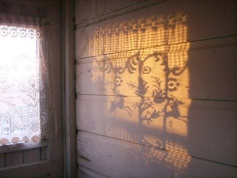 Now, I want more open. Today, I begin searching for lace curtains for 3 other sides of the house — living, kitchen, my bedroom — and figuring out the proper order of layering curtains. There is a time to close them, after all.. My curtains will capture the sun, but the light, my friend.. the Light.
